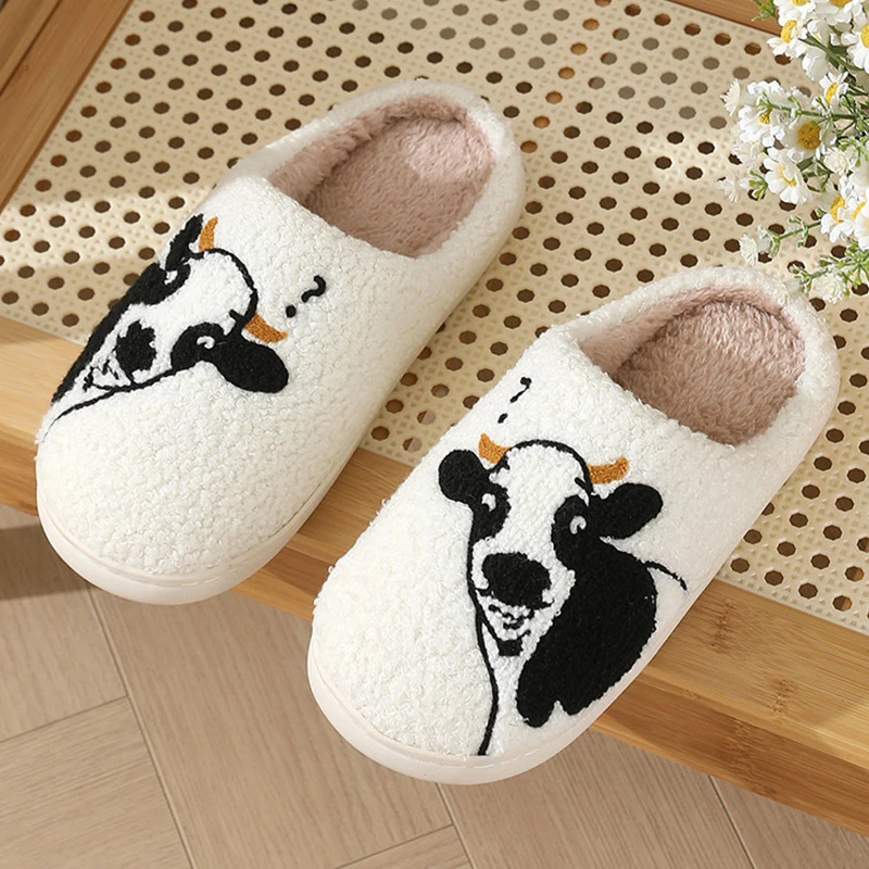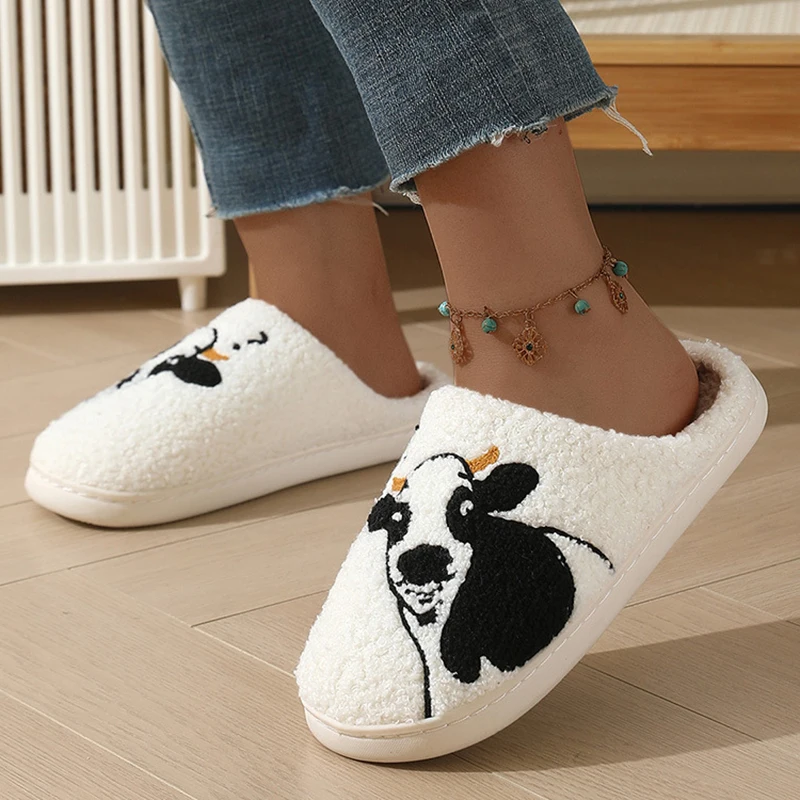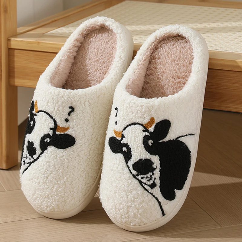 Cow Pattern Cotton Slippers - Winter Warm Cotton Shoes - Woman Comfortable Non Slip Couples Home Slippers
