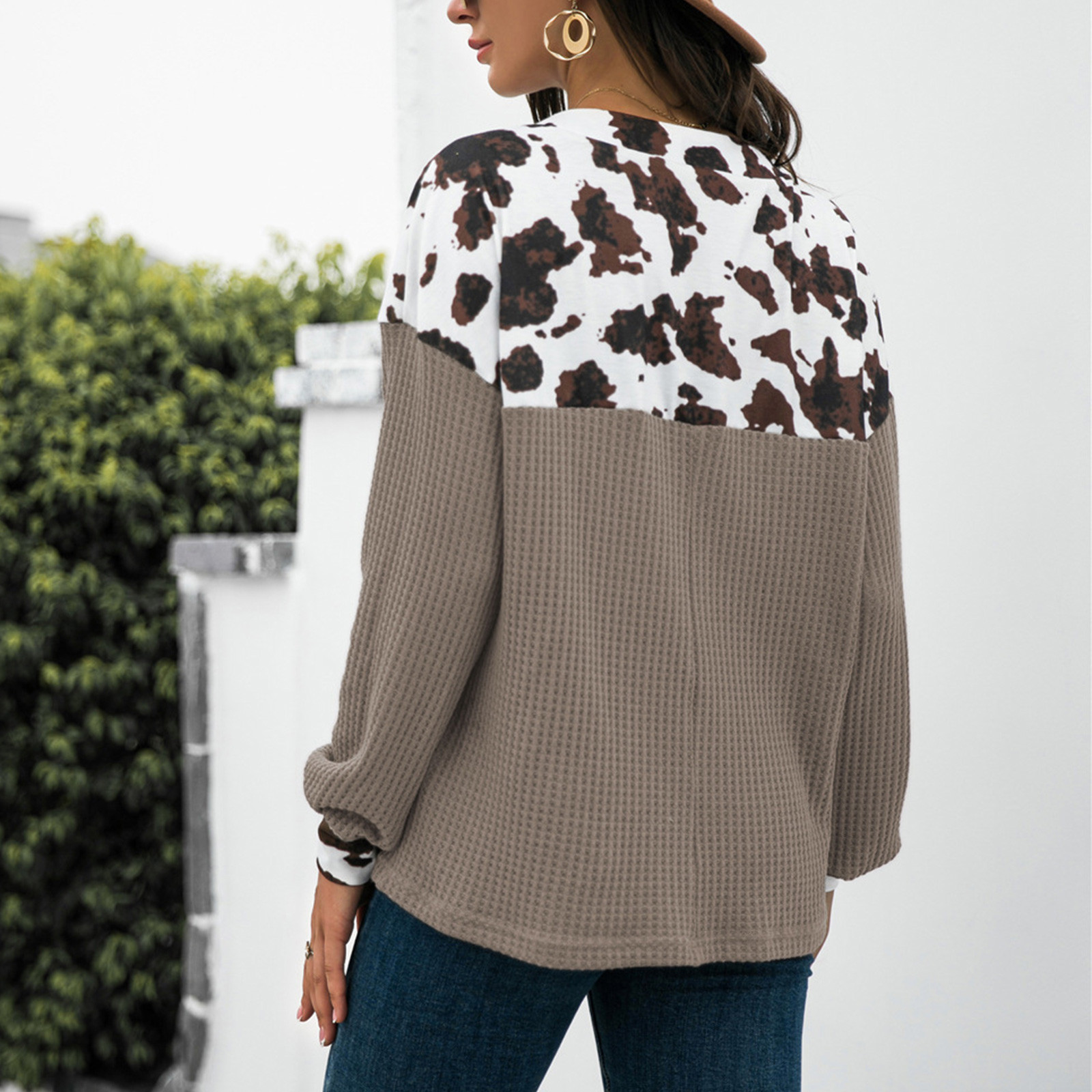 Waffle Sweatshirts Casual Leopard Print Stitching Button Long Sleeve Streetwear Female Top Sudadera Mujer